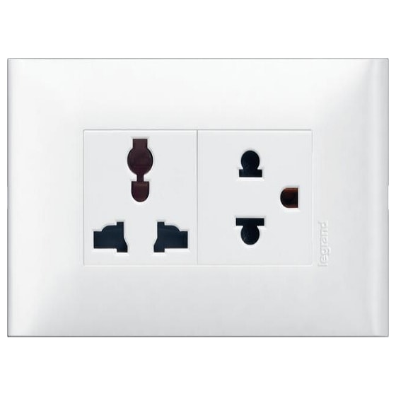 Ổ cắm đa năng có màn che Rivia được thiết kế đơn giản, tinh tế với 1 ổ cắm 3 chấu phích nhỏ và 1 ổ cắm 3 phích chân dẹt.